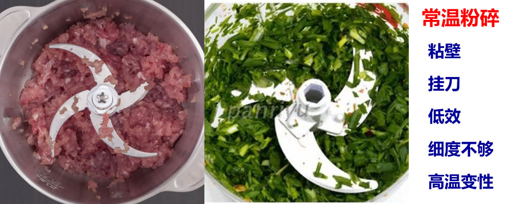 1,高温变软:如高脂肪,高水分的样品,随着温度升高,物料变软并出现粘壁的现象,粉碎效率急剧下降。低温可保持物料的脆性。
