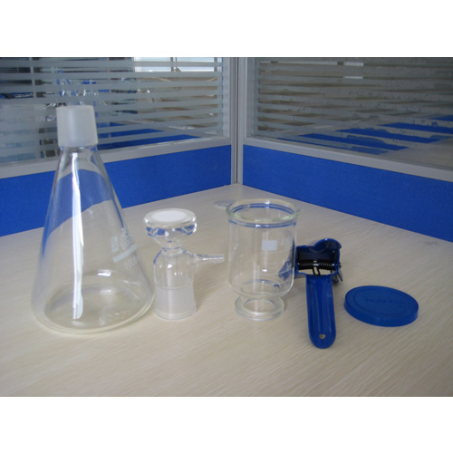 溶剂过滤器组成为:漏斗式过滤杯、砂芯过滤头(烧结滤头,2号砂芯,40-80um)、三角集液瓶、不锈钢制固定夹、塑料杯盖。