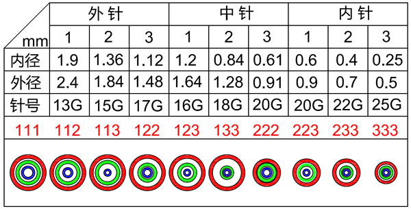 每套标配通用主体针座和三组不同内外径的外、中、内不锈钢针头组合包。客户也可以选择其他的内中外组合,极大地拓展了组合形式并降低了使用成本。如下图是部分内、中、外针头组合的示意图。